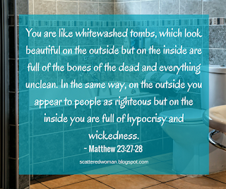 The next time we have guests over, I either need to get over my pride and let them see the mess we really live in on a daily basis, or I need to get over my selfishness and laziness and go organize our junk ahead of time, instead of just stashing it out of sight at the last minute. Maybe I should post Matthew 23:25-28 on our bathroom mirror as a reminder!